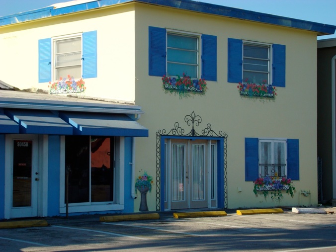 The fake additions to the facade include a brand new ‘window’ on the first floor, ‘shutters’ for all four windows, wrought iron decoration around the front door entrance, window grille, flower boxes & address numbers, and lots of flowers.