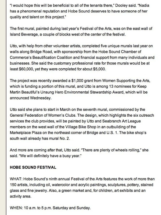 It was very special to celebrate our first year anniversary with another mural - again in conjunction with the annual Hobe Sound Festival of the Arts. The Festival was well attended and we benefited from the many pedestrians who stopped to talk. We were also pleased to receive some donations from this appreciative audience. We started during the cold and rain week before, but were in the completion stage by that week-end.